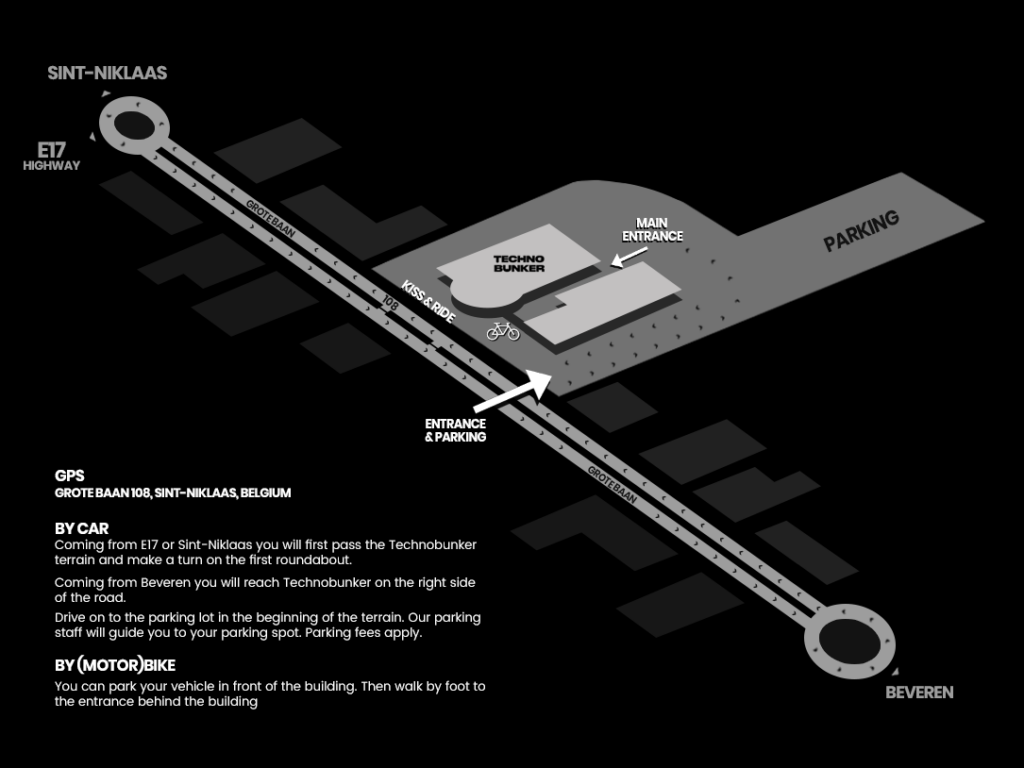 If somebody is bringing you to the festival, please use ‘Grote Baan 108, Sint-Niklaas’ as a GPS destination, Do NOT drive on the parking with the car as parking fees will apply, step out on the main road and walk in the entrance direction by foot.